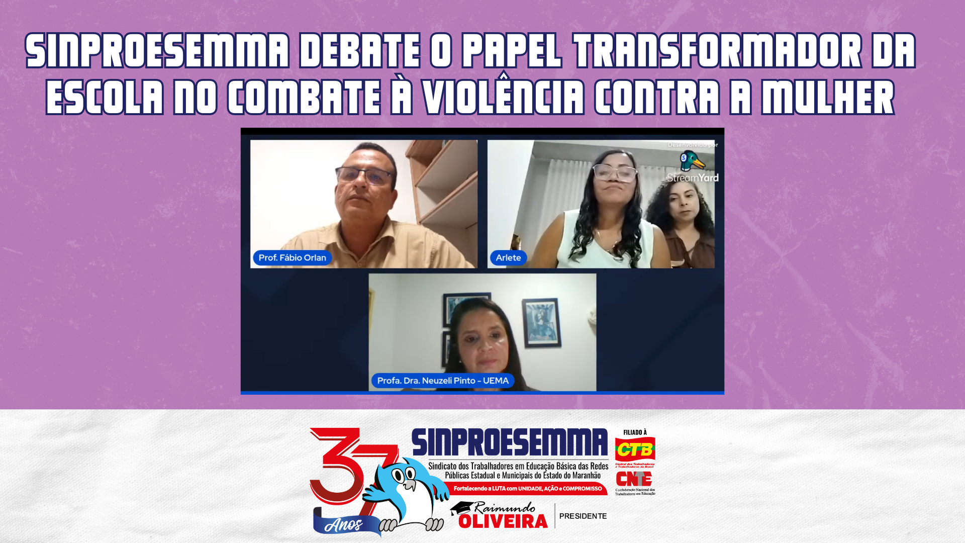 O SINPROESEMMA, por meio da Secretaria da Mulher Trabalhadora, realizou um webinário focado no papel das educadoras no enfrentamento da violência de gênero. O evento, integrante da programação do Mês da Mulher, ocorreu na terça-feira, 03 de março, com transmissão pelo canal oficial da entidade no YouTube. Participaram do debate o vice-presidente do Sinproesemma, Fábio Orlan; a secretária da Mulher Trabalhadora, Arlete Sales; a 1ª secretária adjunta, Queila Cristina; e a doutora em Teoria do Comportamento e professora da UEMA, Neuzeli Maria de Almeida Pinto. A Escola como Agente de Transformação Social Os debatedores ressaltaram que a educação é o pilar central no combate à violência contra a mulher. A premissa defendida é que a mudança de mentalidade não deve…